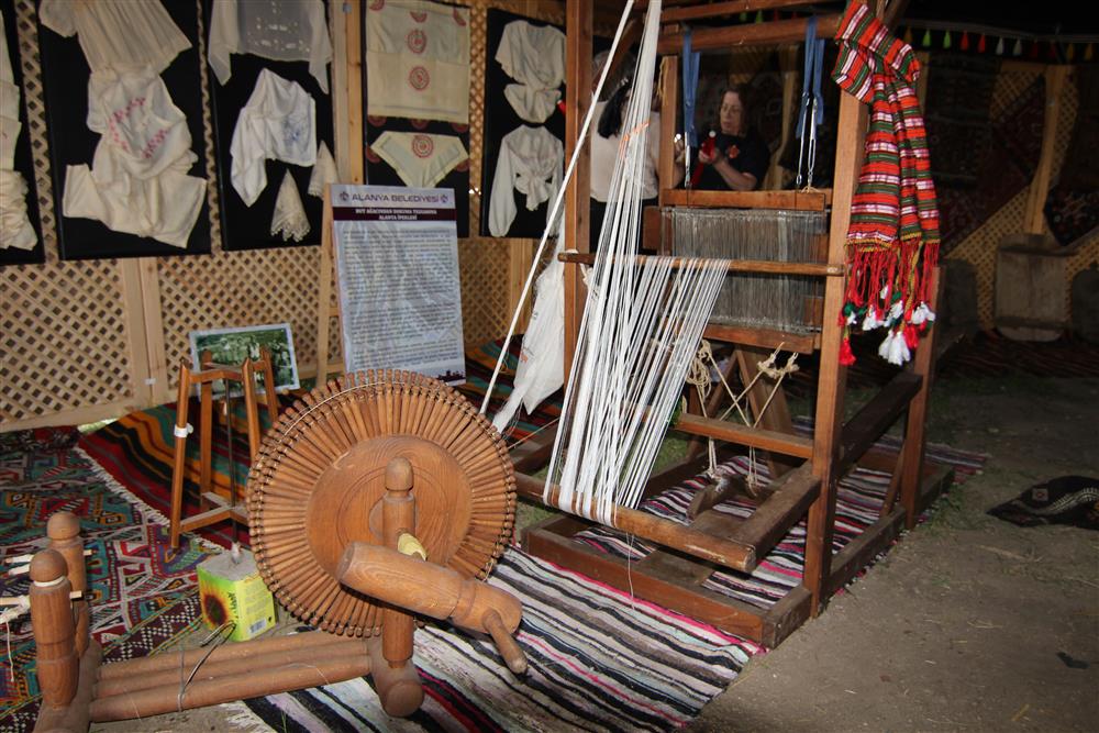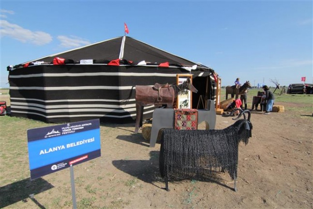 Antalya’nın Aksu ilçesinde düzenlenen ve 6 Mayıs tarihinde açılan Uluslararası Antalya Yörük Türkmen Festivali’ne Alanya Belediyesi de katıldı. 29 ülke, çok sayıda ilçe ve büyükşehir belediyeleri, Yörük dernekleri ve kooperatiflerin katıldığı festivalde, Alanya Belediyesi festivalin en büyük ve en özel çadırıyla yerini aldı. Çadırda Yörük göçünde kullanılan mutfak eşyaları; kazanlar, tencereler, tabaklar, su kapları, hamur tekneleri, ekmek yapmak için kullanılan oklava ve senitler, deve ve eşeklerde taşımacılık için kullanılan heybeler, çuvallar, dokumalar, tarım aletleri; orak ve yabalar, çobanların kullandığı keçe ve kepenekler, rengârenk kilimler, kirmen ve kilim dokuma tezgâhları başta olmak üzere Yörük kültürünü anlatan, besleyen tüm araç ve gereçler Alanya Belediyesi’nin çadırında ziyaretçilere sunuldu. 8 Mayıs’a kadar devam edecek festivalde Alanya Belediyesi’nin çadırını ziyaret eden misafirlere S Pasta ikram edilerek, tezgahlarda dokuma yaptırılıyor ve kirmenle yün eğirtiliyor.