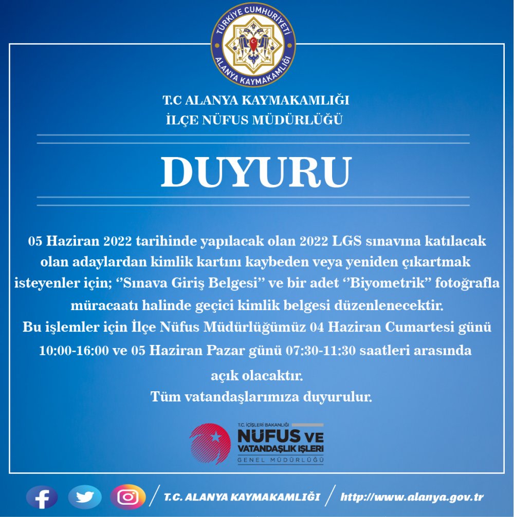 Alanya Kaymakamlığı İlçe Nüfus Müdürlüğü yaptığı açıklamada 5 Haziran tarihinde düzenlenecek olan 2022 LGS sınavına katılacak öğrencilerden kimlik kartlarını kaybedenler ya da yeniden çıkarmak isteyenler için ‘Sınava giriş belgesi’ ve 1 adet biyometrik fotoğrafla müracatları halinde geçici kimlik belgesi düzenleneceği duyuruldu. Açıklamanın tam metni şu şekilde: