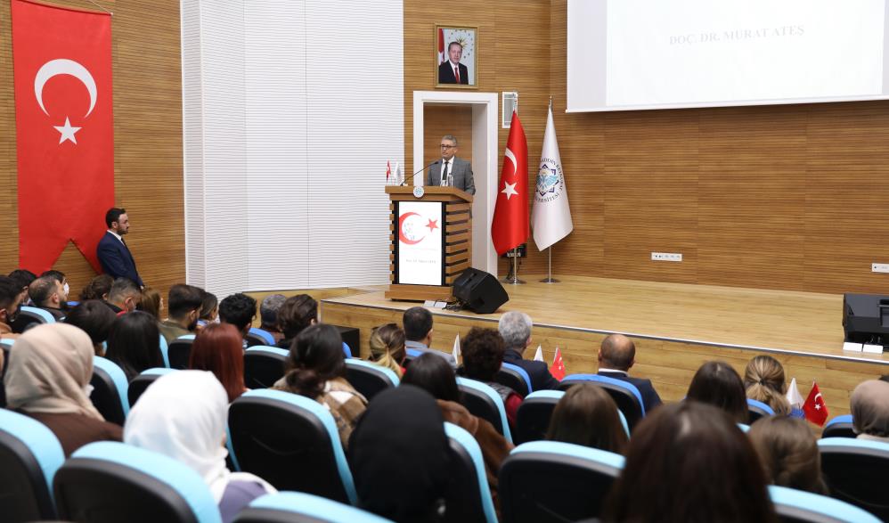 Saygı duruşu ve İstiklal Marşı’nın okunmasının ardından salonda bulunanlara Milli Şair Mehmet Akif Ersoy ve Türk Milli Marşı hakkında bilimsel bilgiler veren Doç. Dr. Murat Ateş, “Milli Marş” kavramını çeşitli kaynaklardan alınmış tanımlarını izleyenlere açıkladı. Ardından “Türk Milli Marşı’nın Doğuşu” konusunda değerlendirmelerde bulunan Doç. Dr. Murat Ateş konuşmasında milli marş kavramı nedir? ve nasıl ortaya çıkmıştır? konusunda kısa bir bilgi verdi. Ateş, “Milli marş, yurtseverlik duygusunun ifadesi olarak hükümetler ve devletler tarafından resmi olarak kabul edilmiş ve halk tarafından sözleri benimsenmiş sözlü müzik parçalarıdır. Bir halkın bütünlüğünün simgesi olarak ulusal günlerde ya da özel günlerde koro halinde söylenilen vatan ve millet aşkını anlatan sözlü müzik parçalarıdır. Aynı zamanda anayasal toplumlarda milleti bütünleştiren bir unsur olarak karşımıza çıkmaktadır” şeklinde konuştu.