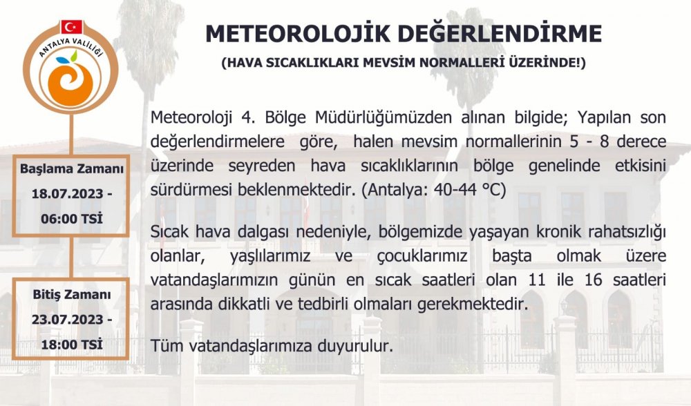 Meteoroloji 4.Bölge Müdürlüğünden yapılan açıklamada Antalya ve çevresi için önemli kavurucu sıcak uyarısı yapıldı. Vatandaşların sıcaklara karşı dikkatli olması gerektiği vurgulanan açıklamada saat 11.00 ile 18.00 arasında dışarı çıkılmaması gerektiği belirtildi.Sıcaklıkların yarından itibaren 5 gün daha sürmesi bekleniyor.