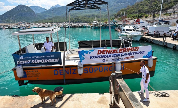 Antalya’da deniz çöpleriyle mücadele çerçevesinde Büyükşehir Belediyesi tarafından alınan ABB Mavi 07 isimli deniz süpürgesi deniz yüzeyindeki fiziksel çöpleri toplayacak. Güneş enerjisinden de faydalanan deniz süpürgesi, su altındaki yosunları biçebiliyor, polen, müsilaj ve petrol türevi atıkları da toplayabiliyor.