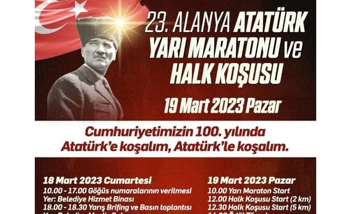Atatürkçü Düşünce Derneği Alanya Şubesi yaptığı açıklamada şu ifadelere yer verdi: 'Atatürkçü Düşünce Derneği Alanya Şubesi olarak 19 Mart 2023 Pazar günü düzenleyeceğimiz Alanya Atatürk Yarı Maratonu ve Halk koşumuza kayıtlarımız devam etmektedir. 5 km Halk koşusuna katılım ücretsiz olmasına karşın; bu yıl 18 Mart 2023 Cumartesi günü kayıt sırasında bağışta bulunmak isteyenler Şubemizin bagış makbuzu karşılığı destekte bulunabilirler. Ayrica Derneğimizin Ziraat Bankası Alanya Şubesi hesabına 5 km farkındalık koşusu olarak bagış da gönderebilirler. Elde edilen bağışlar depremzede vatandaşlarımız için kullanılacaktır. Ülke olarak geçtiğimiz zor günlerde bizde imkanlarımız nispetinde, sporun birleştirici gücüyle katkıda bulunmak istiyoruz. Tüm vatandaşlarımızı bekleriz.'
