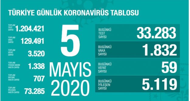Sağlık Bakanlığı, korona virüse ilişkin 5 Mayıs 2020 tarihli son verileri açıkladı. Son 24 saatte korona virüs nedeniyle 59 kişinin hayatını kaybettiğini, toplam can kaybının ise 3 bin 520‘e yükseldiğini bildirdi. Açıklamaya göre bugün 33 bin 283 test yapılırken, bin 832 yeni vaka tespit edildi.