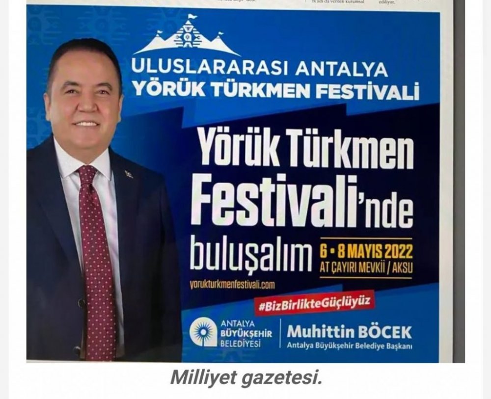 Odatv’nin haberine göre, Antalya Büyükşehir Belediye Başkanı Muhittin Böcek, 6-8 Mayıs tarihleri arasında yapılacak Uluslararası Antalya Türkmen Yörük Festivali’nin tanıtımı için sadece Demirören Haber Grubu’na ait Hürriyet ve Milliyet gazetelerine ilan verdi.
