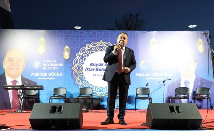 Büyük Aile İftar buluşmasına katılan Büyükşehir Belediye Başkanı Muhittin Böcek, siyasi partilerin ilçe başkanları, meclis üyeleri, muhtarlar, STK temsilcileri ve çok sayıda Kumlucalı vatandaşla iftar yaptı. Başkan Böcek, 11 ayın sultanı Ramazan ayında Kumlucalı hemşerileri ile bir arada olmaktan mutluluk duyduğunu belirterek, “Kumlucalı vatandaşlarım seni bekler deyince koşarak geldim. Allah’ım tuttuğunuz, tuttuğumuz oruçları kabul etsin” dedi.
