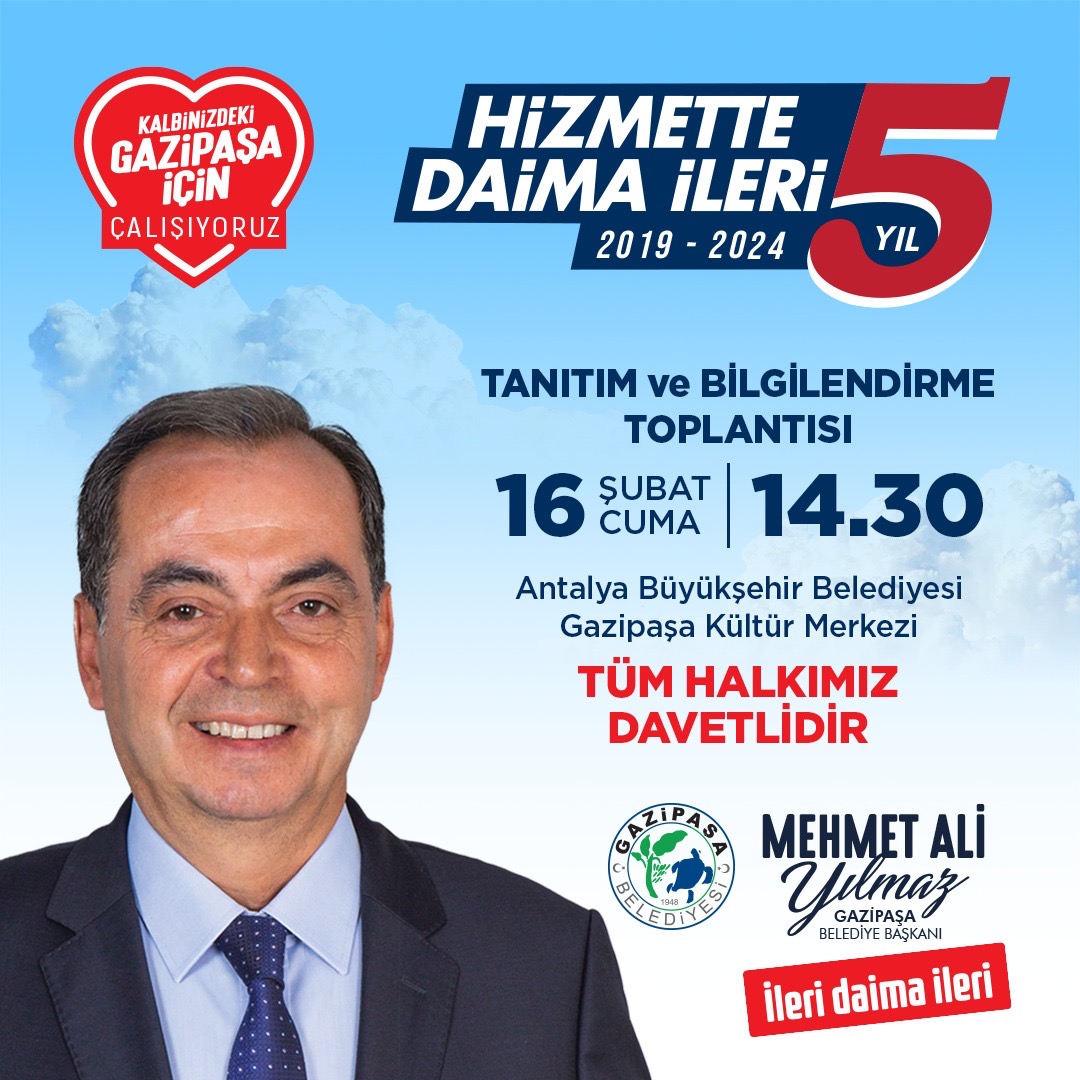 Gazipaşa Belediye Başkanı Mehmet Ali Yılmaz, beş yılın çalışmalarını ilçe halkına daha kapsamlı anlatmak için tanıtım ve bilgilendirme toplantısı düzenleyecek. Tanıtım ve bilgilendirme toplantısı, 16 Şubat Cuma Günü, saat 14.30’da Antalya Büyükşehir Belediyesi Gazipaşa Kültür Merkezi’nde gerçekleşecek.