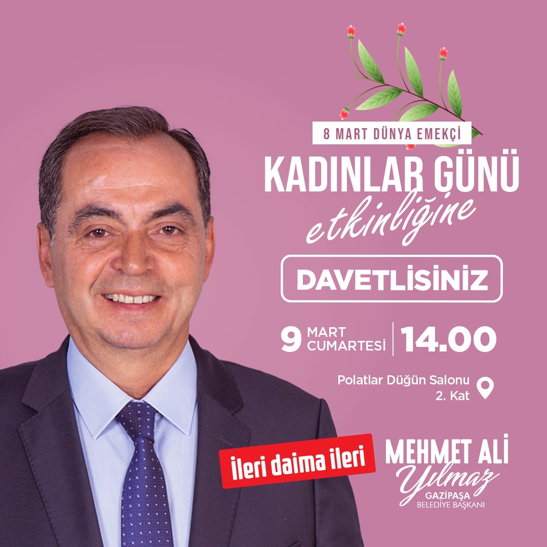 Gazipaşa Belediye Başkanı Mehmet Ali Yılmaz, CHP Gazipaşa Kadın Kolları İş birliği ile 8 Mart Dünya Emekçi Kadınlar Gününe özel bir etkinlik hazırladı. 9 Mart Cumartesi günü saat 14.00’te Gazipaşa Polatlar Düğün Salonunda yapılacak etkinlikte, Gazipaşalı hanımlar eğlenceli müzik ve ikramlar eşliğinde ağırlanacak.
