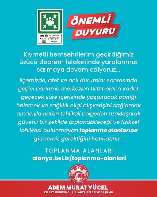 Alanya Belediye Başkanı Adem Murat Yücel yaptığı açıklamada şu ifadelere yer verdi: 'Kıymetli hemşehrilerim afet ve acil durumlar sonrasında tehlikeli bölgeden uzaklaşmak amacıyla oluşturduğumuz toplanma alanlarına aşağıdaki linkten ulaşabilirsiniz.'