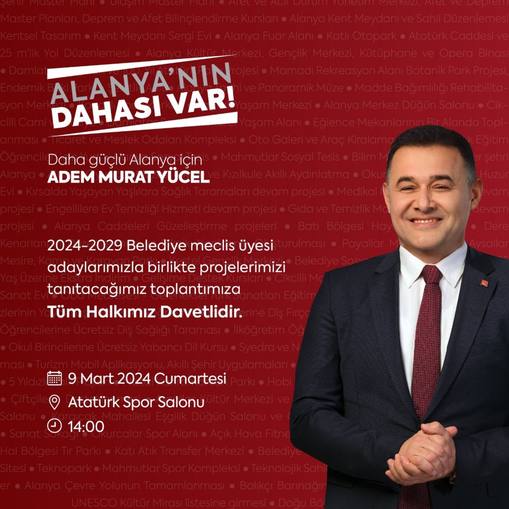 Alanya Belediye Başkanı ve Cumhur İttifakı Alanya Belediye Başkan Adayı Adem Murat Yücel’in; 2024-2029 projelerini ve belediye meclis üyelerini tanıtacağı lansman toplantısı 9 Mart Cumartesi günü, saat 14.00’te Atatürk Spor Salonu’nda gerçekleştirilecek. Başkan Yücel lansmana tüm vatandaşları davet etti.