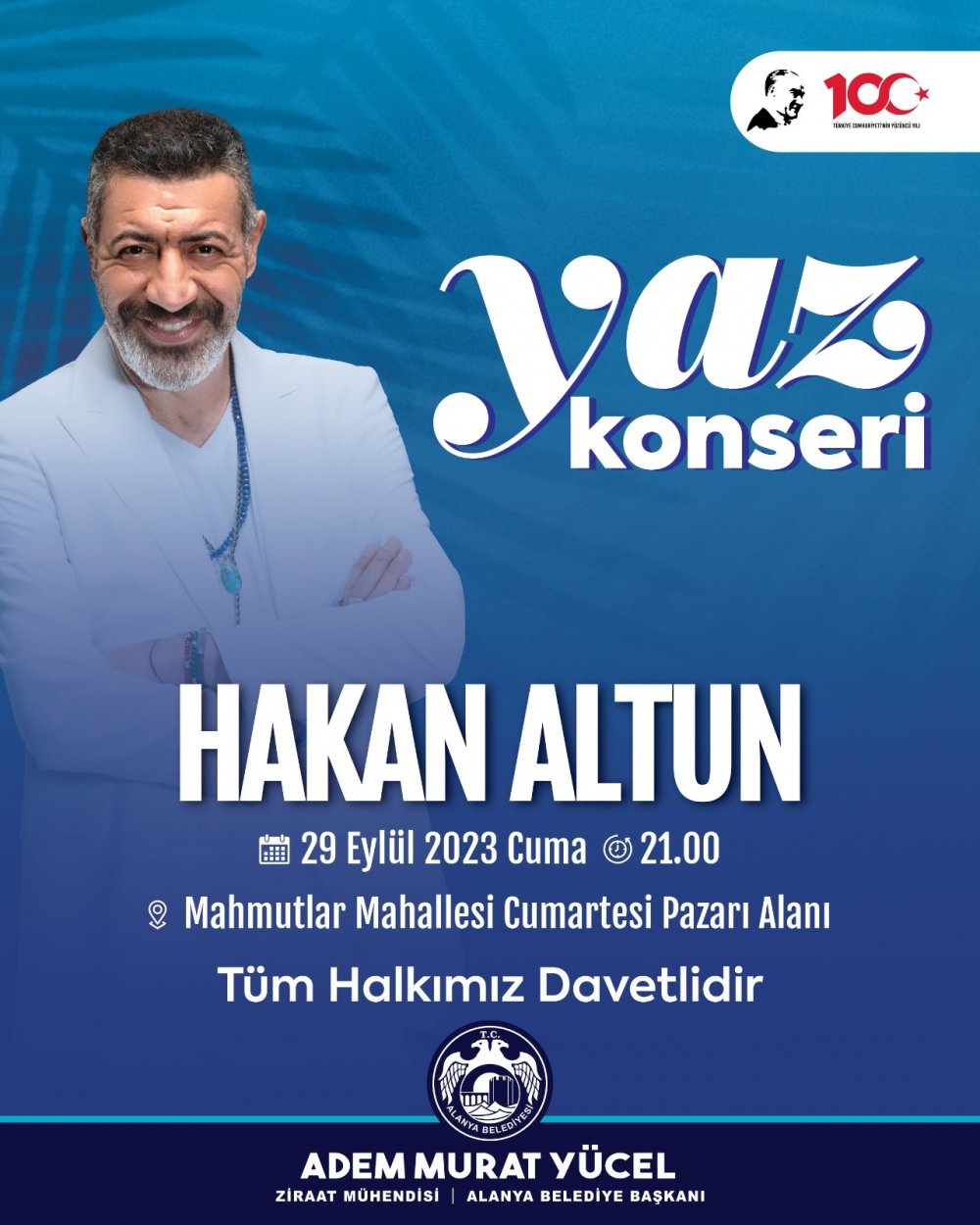 Hakan Altun konserine tüm vatandaşları davet eden Başkan Yücel, “Alanya merkezde olduğu gibi doğu ve batı bölgelerimizde de sosyal etkinliklerimiz ile vatandaşlarımızı buluşturuyoruz. Yaz Konserlerimiz kapsamında Mahmutlar Mahallemizde bir konser organize ettik. Bu kapsamda Hakan Altun, 29 Eylül Cuma günü vatandaşlarımızla bir araya gelecek. Başta doğu bölgesinde yaşayan vatandaşlarımız olmak üzere tüm halkımızı Hakan Altun konserine davet ediyorum.” dedi.