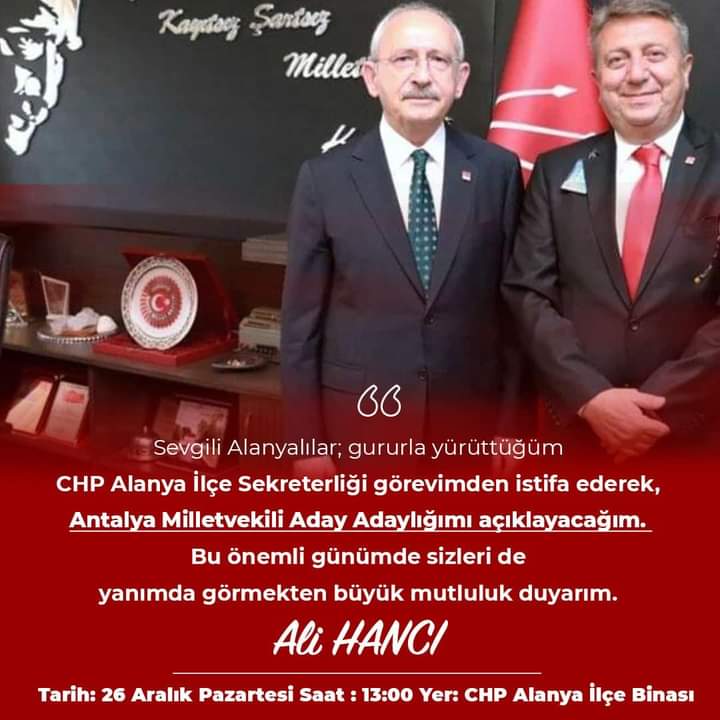 CHP Alanya İlçe Sekreteri Ali Hancı, milletvekili aday adayı olmak için bugün görevinden istifa ediyor. Hancı yaptığı açıklamada şunları söyledi: