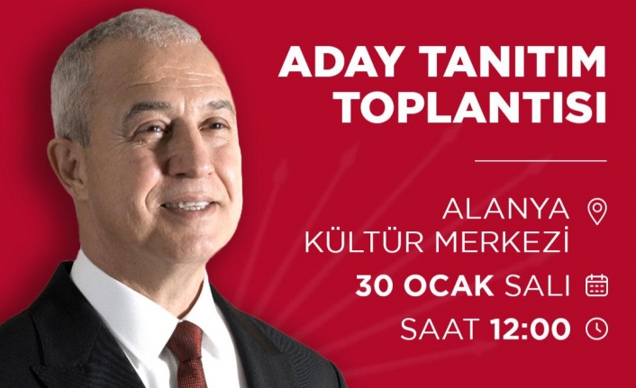 Cumhuriyet Halk Partisi Alanya Belediye Başkan Adayı Osman Tarık Özçelik'in Alanya halkı ile buluşması için planlanan tanıtım toplantısı 30 Ocak Salı saat 12.00'de yapılacak.