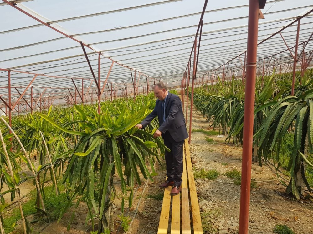 Örtü altında ilk kez üretilen yenidünya hasadının ardından Alanya İlçe Tarım Müdürü Mehmet Rüzgar, Alanya Ziraat Odası Başkanı Tahir Göktepe, İlçe Tarım müdürlüğü teknik personeli ve üreticiler örtü altında üretilen yenidünya, mango ve pitaya seralarını birlikte gezerek incelediler.