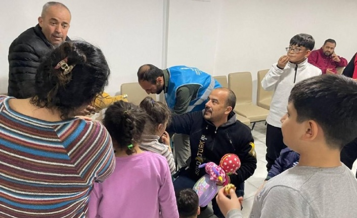 Gazipaşa'da arama kurtarma gönüllüsü bir esnaf depremzede çocuklar için topladığı oyuncakların dağıtımını yaptı.