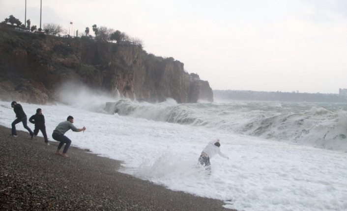 Meteorolojinin kuvvetli yağış ve fırtına nedeniyle 'turuncu' kodlu uyarıda bulunduğu turizm şehri Antalya’da, fırtına etkisini devam ettiriyor. Oluşan dev dalgalar rüzgarla birlikte falezler boyuna kadar yükseldi. Konyaaltı Sahili ise neredeyse dalgaların altında kaldı. Yaklaşık 6-7 metre yüksekliğe kadar yükselen dev dalgaları görüntülemek isteyenler ise varyant seyir terasından sahile indi. Bazı turistler su altında kalan kayalık alandan dalgaları izledi, bazı vatandaşlar ise öz çekim yaptı. Bir vatandaş ise dalgaların dövdüğü kayanın üzerine çıktı ve şemsiye açarak manzara izledi. Dalgaların geri çekilmesiyle kumsala inen bazı gençler adeta ölüme meydan okudu. Dalgaya kapılma tehlikesine rağmen gençler, video çekmeye devam etti. Beline kadar ıslanan ve güçlükle kaçan gençler tehlikeye davetiye çıkardı. Dalgalara kapılmaktan son anda kurtulan gençler yürekleri ağza getirdi. Bazı turistler ise dalgaların azizliğine uğrayarak ıslandı. 5 arkadaşın ise rüzgarı arkasına alıp el ele tutuşarak fotoğraf çektirdiği görüldü.