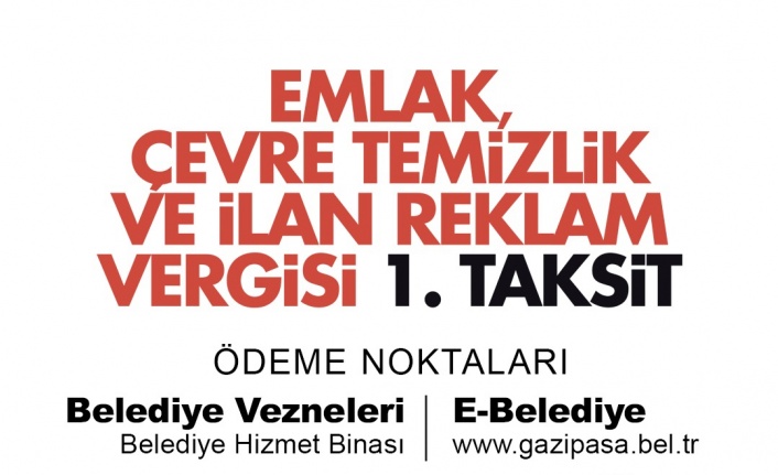 Konu ile ilgili açıklama yapan Gazipaşa Belediye Başkan Yardımcısı Adem KAYA, “Türkiye sınırları içinde bulunan bina ve arsalar 1319 sayılı Kanun hükümlerine göre emlak vergisine tabi tutuluyor. Vergi senede iki eşit taksitte ödeniyor. İlk taksidin en son ödeme günü 31 Mayıs 2023. Çevre temizlik vergisi de, belediyelerin sunduğu çevre temizlik hizmetleri için konut, işyeri ve diğer şekillerde kullanılan yapılardan alınıyor. Meskenlerin çevre temizlik vergisi su faturalarına yansıtılırken işyerlerinin vergisi de emlak vergisi gibi yılda iki eşit taksitle ödeniyor. Bu kapsamda işyeri ve diğer şekillerde kullanılan yapılar için belediyeye çevre temizlik vergisi ödemesi yapılması gerekiyor. Vatandaşlarımızın mağdur olmamaları ve cezalı duruma düşmemeleri için vergilerinin ilk taksitlerini 31 Mayıs 2023 Çarşamba günü mesai bitimine kadar ödemeleri gerekmektedir. Vatandaşlarımız, vergilerini Belediyemiz veznelerine nakit ve kredi kartı ile ödeyebilecekleri gibi www.gazipasa.bel.tr sitemizin E- Belediye modülü ile internet üzerinden de ödeme yapabilirler. Belediyemize borcu bulunan vatandaşlarımızın ödemelerini ihmal etmemelerini rica ederiz” dedi.