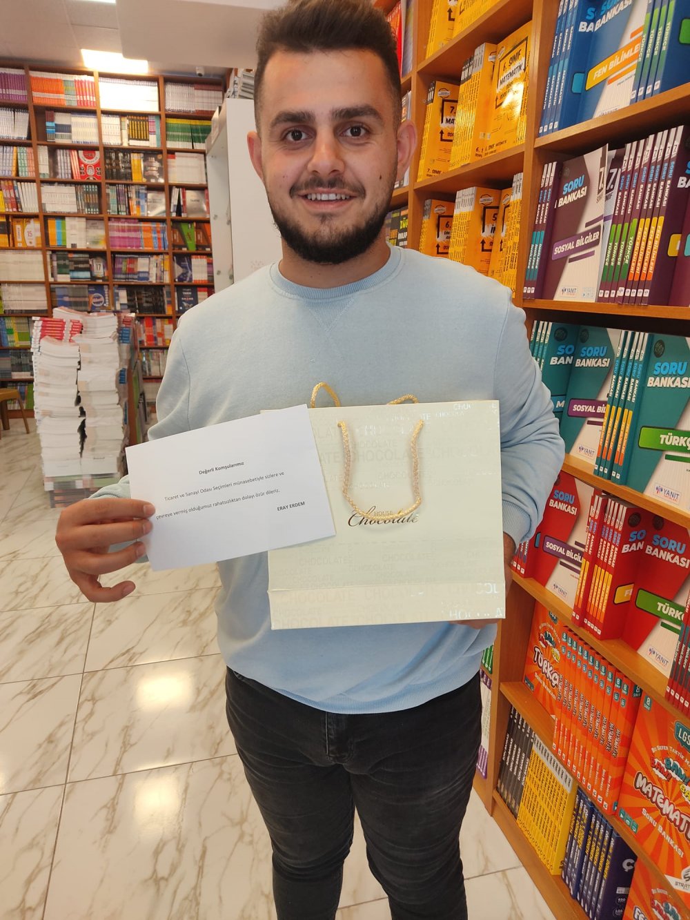 Seçim süreci ve sonrasında yaptığı açıklamalarından, seçim ofisi çevresindeki konut ve işyerlerine yönelik ‘Verdiğimiz rahatsızlıktan dolayı özür dileriz’ diyen Eray Erdem bu sözlerini harekete döktü. Erdem, Tefikiye Caddesi’ndeki esnaflara çikolata ile mektup gönderdi.