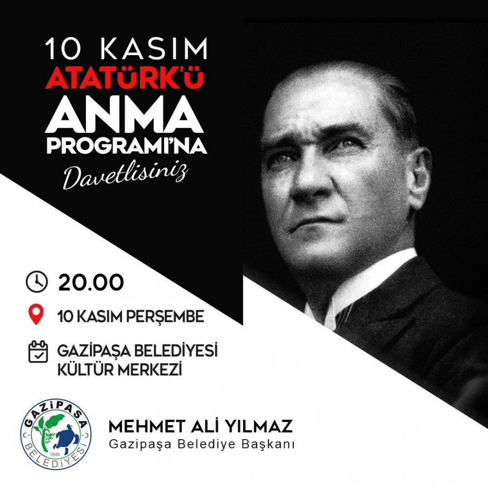 10 Kasım günü sabah yapılan anma etkinliklerinin ardından, akşam Gazipaşa Belediyesi Kültür ve Sosyal İşler Müdürlüğü tarafından Belediye Kültür Merkezi’nde şiirlerle, türkülerle Atatürk’ü anma programı yapılacak. 10 Kasım Perşembe günü saat 20.00’de başlayacak olan programa tüm ilçe halkını davet eden Gazipaşa Belediye Başkanı Mehmet Ali Yılmaz, “ Cumhuriyetimizin kurucusu Ulu Önderimiz Gazi Mustafa Kemal Atatürk’ü ölümünün 84. Yıldönümünde saygı ve özlemle anıyorum. Ata’mıza olan saygımız ve sevgimiz hiçbir zaman bitmeyecek. Bize miras bıraktığı Cumhuriyeti’mizi aydınlık geleceğimize taşımaya devam edeceğiz. 10 Kasım Perşembe günü saat 20.00’de Kültür Merkezimizde düzenleyeceğimiz Atatürk’ü anma programımıza tüm halkımızı bekliyoruz.” dedi.