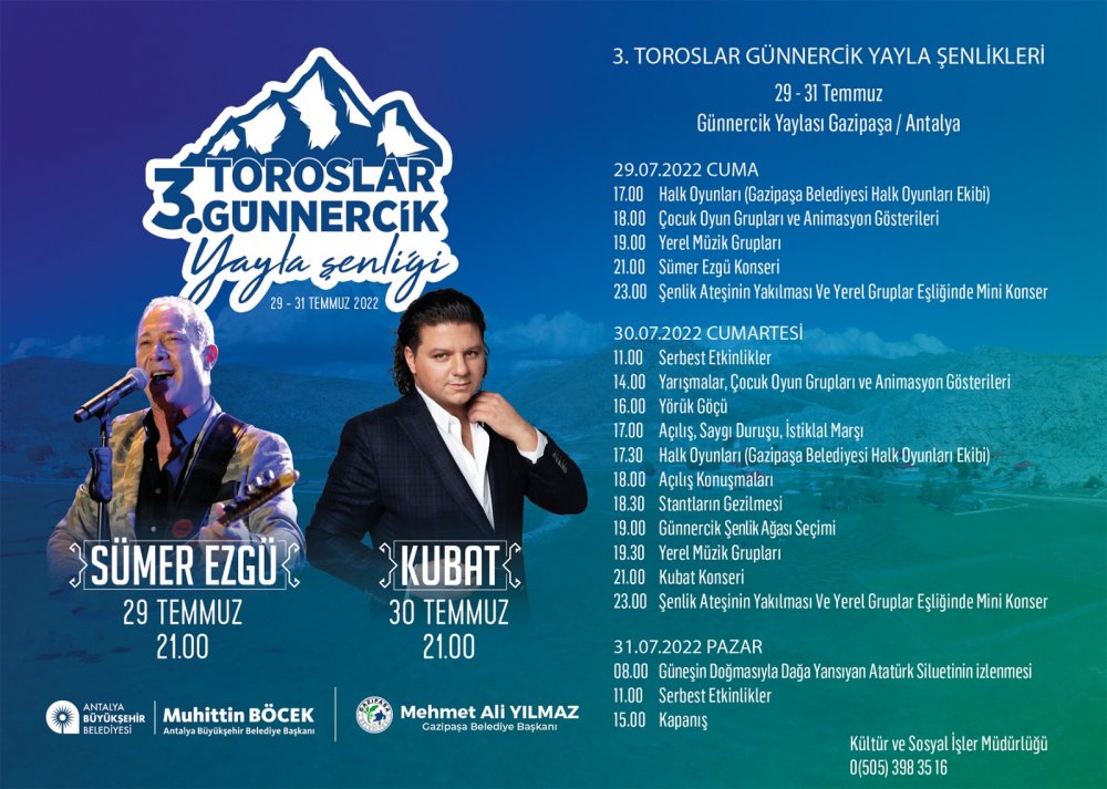 Gazipaşa Belediyesi Kültür ve Sosyal işler Müdürlüğü ve Antalya Büyükşehir Belediyesi Kültür Daire Başkanlığı tarafından düzenlenecek olan şenlik, 29-30 ve 31 Temmuz tarihlerinde Gazipaşa’nın Günnercik Yaylası’nda yapılacak. Günnercik Yayla Şenliği’nde vatandaşlar yaylada kamp kurma imkanına sahip olacak. 29 Temmuz Cuma günü Sümer Ezgü ve 30 Temmuz Cumartesi Günü Kubat’ın sahne alacağı şenlikte yerel sanatçılarda yer alacak, yöresel ve geleneksel oyunlar oynanacak. Şenliğin simgesi haline gelen Yörük Göçü 30 Temmuz Cumartesi günü saat 16.00’da başlayacak. Çocukların şenlikte doyasıya eğlenmesi için çocuk oyun grubu ve animasyon etkinlikleri ilk iki gün aktif olacak. İki gün boyunca konser sonrasında şenlik ateşi yakılacak. Şenliğin son günü sabah erken saatlerde Günnercik yaylasının sembolü olan dağa yansıyan Atatürk silüeti izlenecek.