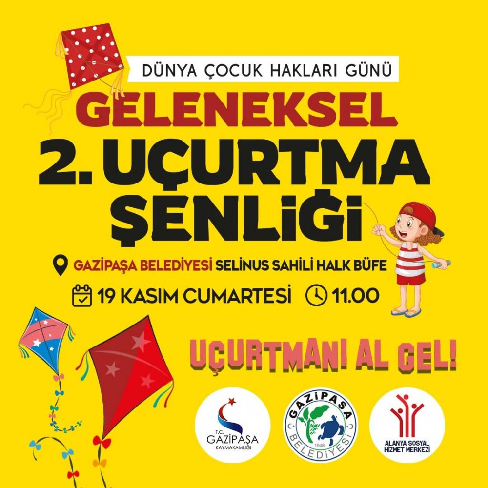 Gazipaşa Belediyesi Kültür ve Sosyal İşler Müdürlüğü ve Alanya Sosyal Hizmet Müdürlüğü tarafından çocuk haklarına farkındalık kazandırmak için “Uçurtmanı al gel” sloganıyla 2. Geleneksel Uçurtma Şenliği düzenleniyor. 20 Kasım Dünya Çocuk Hakları Günü nedeniyle, 19 Kasım Cumartesi günü saat 11.00’de Selinus Sahili Halk Büfede yapılacak olan şenliğe katılımın yüksek olması bekleniyor.