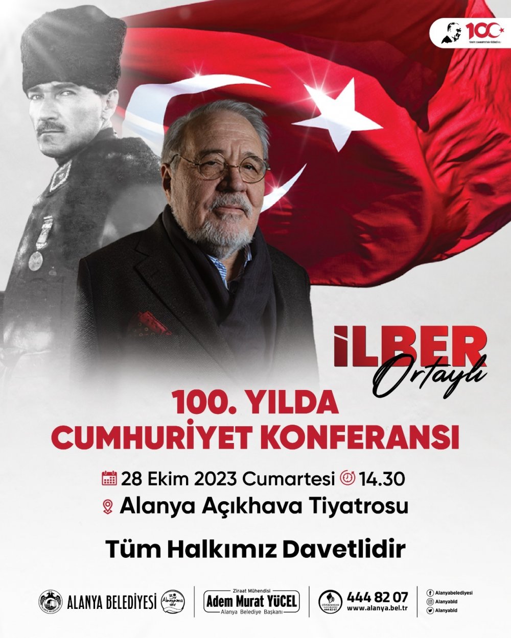 100. Yılda Cumhuriyet Konferansı; 28 Ekim Cumartesi günü saat 14.30’da Dinek Mevkinde bulunan Alanya Açıkhava Tiyatrosu’nda gerçekleştirilecek. Alanya Belediye Başkanı Adem Murat Yücel katılımın ücretsiz olduğu konferansa tüm Alanya halkını davet etti. Başkan Yücel, “Cumhuriyetimizin 100. yılını birbirinden güzel etkinliklerle kentimizin her bir köşesinde kutluyoruz. Dolu dolu geçirdiğimiz bu anlamlı haftada ülkemizin en önemli tarihçilerinden olan İlber Ortaylı Hocamızı konferans için kentimize davet ettik. Sayın Ortaylı’nın engin bilgi ve birikimlerini dinleyeceğimiz bu konferansa 7’den 70’e tüm halkımızı bekliyoruz.” dedi.