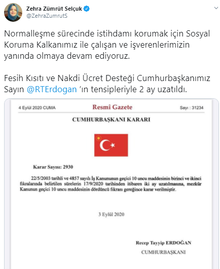 Aile, Çalışma ve Sosyal Hizmetler Bakanı Zehra Zümrüt Selçuk, "Fesih kısıtı ve Nakdi Ücret Desteği Cumhurbaşkanımız Recep Tayyip Erdoğan'ın tensipleriyle 2 ay uzatıldı" dedi.