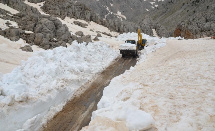 Antalya Büyükşehir Belediyesi Kırsal Hizmetler Daire Başkanlığı ekipleri, Toros Dağları'nda yayla yollarını iş makineleri yardımıyla göçerlerin yaylalara çıkması için 5 Mayıs'tan itibaren karla mücadele çalışması sürdürdü.