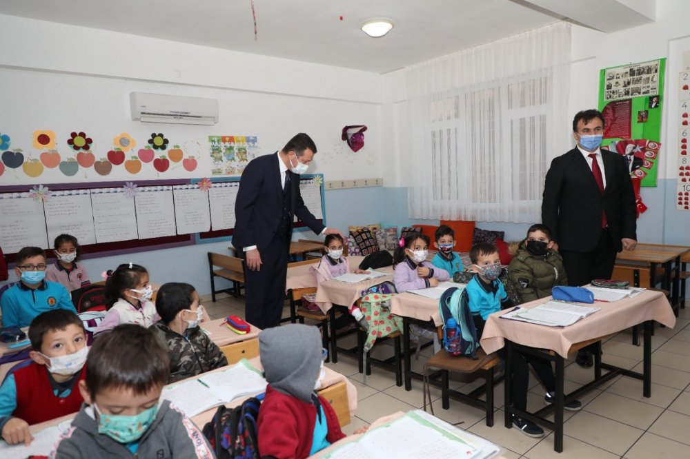 Bayrak ve İstiklal Marşı töreninden sonra sınıf ziyaretlerinde bulunan Kaymakam ÜRKMEZER, Anasınıfı öğrencilerini ziyaret ederek öğrencilerin serbest çalışma etkinliklerini izledi. Anasınıfları ziyaretinden sonra 1. sınıfları ziyaret eden Ürkmezer, burada Kaymakamlıkça bastırılan okuma kitaplarını dağıtarak ziyaret ettiği 1. sınıf öğrencileri ile birlikte kitap okudu.