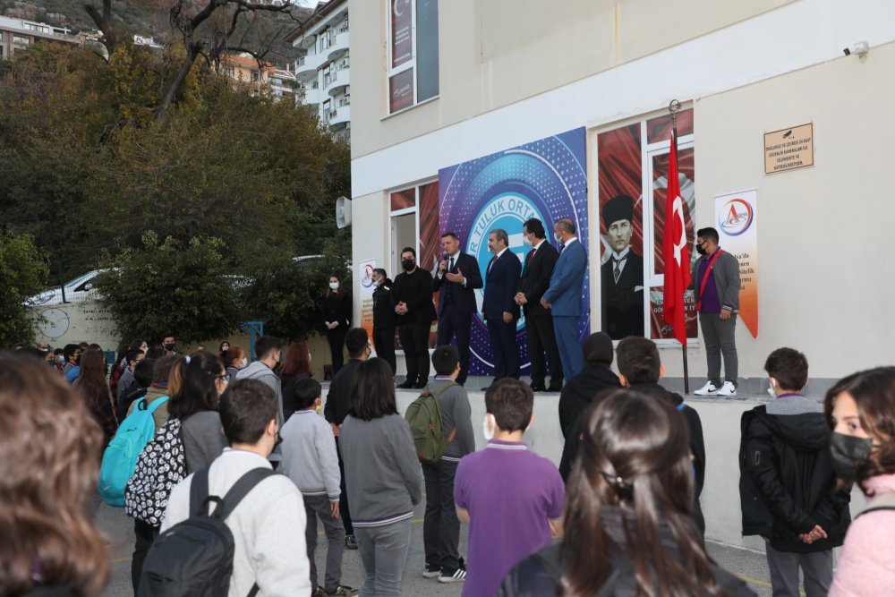 Tahir Tuluk Ortaokulu’nu yaptıran hayırsever iş adamı Tahir Tuluk’un da katıldığı okul ziyaretinde Bayrak Töreni ve İstiklal Marşı programına katılan Kaymakam Ürkmezer ilk olarak öğrencilere hitap ederek; “Sevgili öğrenciler günaydın öncelikle okulumuzu yaptıran Tahir beyle böyle bir programda beraber olmak bizi mutlu etti, kendisine teşekkür ediyoruz. Her şey hayal etmekle ve o hayali gerçekleştirmek için çalışmakla başlar. Sizin birbiriniz arasında hiçbir fark yok, sadece hayal etme ve çalışma farkı var. Bizler de öğrencilerimizin daha iyi noktalara gelmeleri için çalışıyor ve Alanya’mızın daha iyi noktaya gelmesi için sizlere güveniyoruz. Bu kapsamda her hafta okulları ziyaret ederek öğrencilerimizin iyi alışkanlıklar edinmesini, ne iş yaparsa yapsınlar azimle ve gayretle yapmalarını sağlamaya çalışıyoruz. Bizim sizden ilk ricamız yaptığınız işin en iyisini yapmanız. Sizden bir diğer ricamız ise kitap okumanız. Günde en az 40 dakika kitap okuyun. Biliyorsunuz pandemi hepimizi etkiledi sağlığınız için maske, mesafe ve hijyen kurallarına da uymalısınız” dedi.