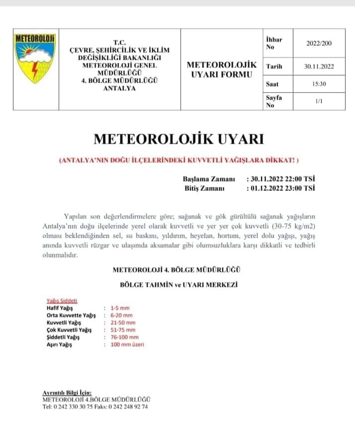 Yapılan açıklamada bu geceden itibaren kuvvetli ve yer yer çok kuvvetli sağanak yağış uyarısı yapıldı. Yarın öğleden sonra etkisini kaybetmesi beklenen yağışlar için vatandaşlar ve üreticiler olası olumsuzluklar karşısında tedbirli olunması konusunda uyarıldı.