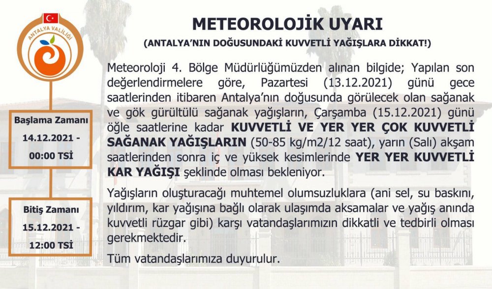 “Bu gece saatlerinden itibaren Antalya'nın doğusunda görülecek olan sağanak ve gök gürültülü sağanak yağışların, 15 Aralık Çarşamba günü öğle saatlerine kadar 'kuvvetli ve yer yer çok kuvvetli' (50-85 kg), salı akşam saatlerinden sonra iç ve yüksek kesimlerinde 'yer yer kuvvetli kar yağışı' şeklinde olması beklendiğinden ani sel, su baskını, yıldırım, kar yağışına bağlı olarak ulaşımda aksamalar ve yağış anında kuvvetli rüzgar gibi olumsuzluklara karşı dikkatli ve tedbirli olunması gerekmektedir."