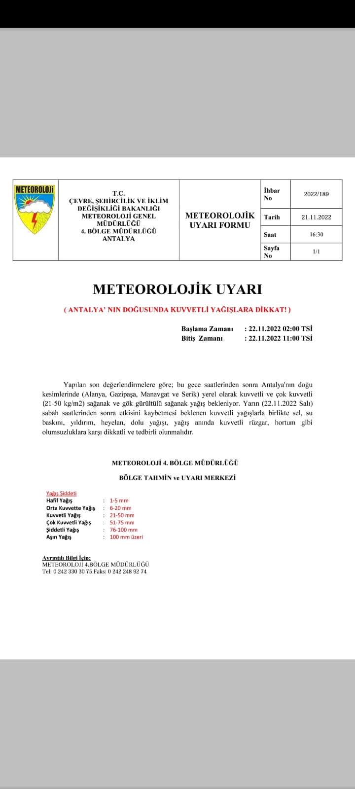 Yapılan açıklamada bu geceden itibaren kuvvetli ve yer yer çok kuvvetli sağanak yağış uyarısı yapıldı. Yarın öğleden sonra etkisini kaybetmesi beklenen yağışlar için vatandaşlar ve üreticiler olası olumsuzluklar karşısında tedbirli olunması konusunda uyarıldı.