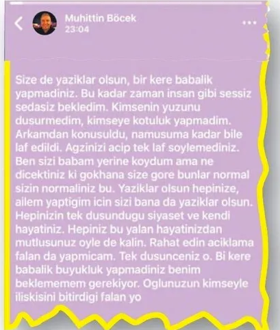 Muhittin Böcek’in Whatsapp uygulamasından paylaştığı mesajda “Size de yazıklar olsun. Bir kere babalık yapmadınız. Bu kadar zaman insan gibi sessiz sedasız bekledim. Kimsenin yüzünü düşürmedim, kimseye kötülük yapmadım. Arkamdan konuşuldu, namusuma kadar bile laf edildi. Ağzınızı açıp tek laf söylemediniz. Ben sizi babam verine koydum ama ne diyecektiniz ki Gökhan’a, size göre bunlar normal sizin normaliniz bu. Hepinizin tek düşündüğü siyaset ve kendi hayatınız. Hepiniz bu yalan hayatınızdan mutlusunuz öyle de kalın. Rahat edin açıklama falan da yapmayacağım. Tek düşünceniz o. Bir kere babalık büyüklük yapmadınız. Benim beklememem gerekiyor. Oğlunuzun kimseyle ilişkisini bitirdiği falan yok” yazdığı görüldü.