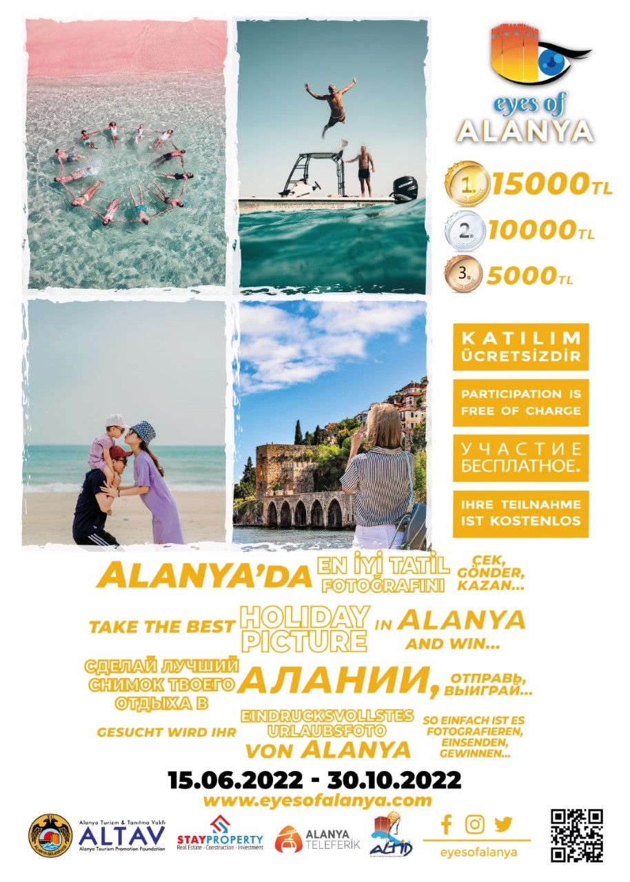 ALTAV ve ALTİD Başkan Yardımcısı Mehmet Dahaoğlu, “Alanya’nın tanıtımını her alanda sürdürüyoruz. Bu anlamda www.eyesofalanya.com web sitesi üzerinden duyurduğumuz ‘Eyes of Alanya’ fotoğraf yarışması kayıtları başladı. Cep telefonuyla çekilen fotoğrafların da kabul edildiği eğlenceli bu yarışmada derece alacak olan ilk 3 katılımcıya toplamda 30 bin TL para ödülü verilecek. Yerli ve yabancı tüm vatandaşlarımızı, tatilcilerimizi bu yarışmaya davet ediyoruz” dedi.
