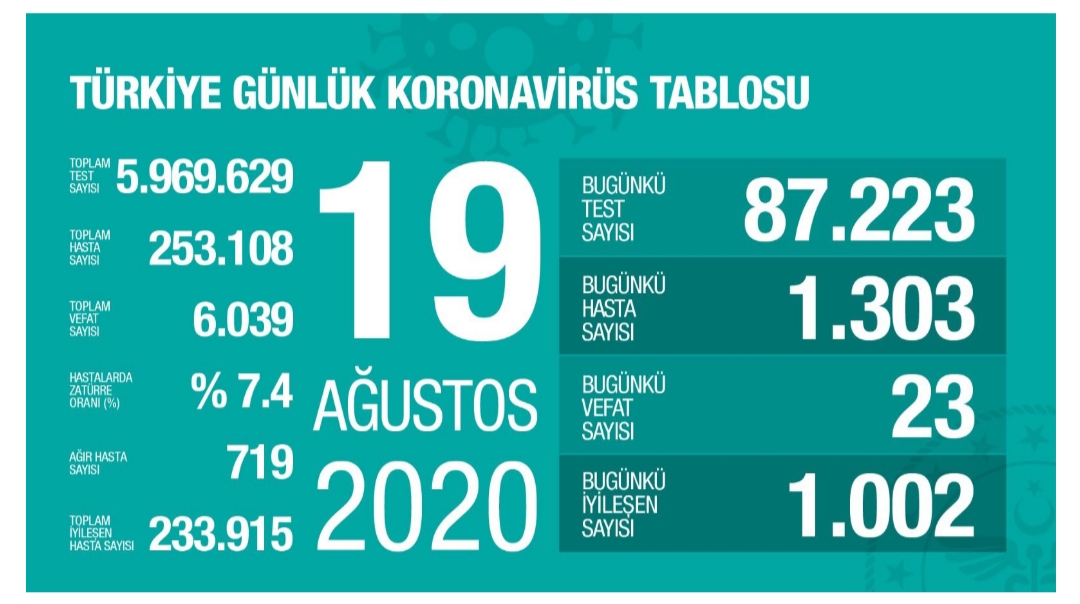 Sağlık Bakanı Fahrettin Koca, “Vaka sayımız, bin 300'ün üzerine çıktı. Düne kıyasla, pozitif tanı sayımız 40 fazla. Artışın kontrol altına alınması, hep birlikte bize bağlı. Maske, mesafe ve temizlik konusunda ödünsüz olun. Bu tabloyu, ihmallerin ve tedbirlerin belirlediğini unutmayın” ifadelerini kullandı. Güncelleme Tarihi: 19 Ağustos 2020, 20:49