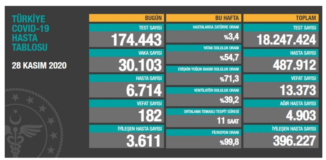 Sağlık Bakanlığı, son 24 saatte 182 kişinin korona virüsten hayatını kaybettiğini, 30 bin 103 yeni vaka sayısının olduğu açıkladı.