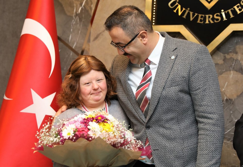 Alanya Alaaddin Keykubat Üniversitesi (ALKÜ) Hayallere Hayat Veren Topluluğunun katkılarıyla Antalya Muratpaşa Gençlik Merkezi tarafından düzenlenen atletizm etkinliğine katılan ve madalya kazanan özel öğrenciler, Topluluk Danışmanı Doç. Dr. Sibel Nalbant, topluluğun temsilcileri ve özel öğrencilerin aileleri ALKÜ Rektörü Prof. Dr. Ekrem Kalan’ı makamında ziyaret etti. Elde edilen başarılardan dolayı özel öğrencileri tebrik eden Rektör Kalan özel öğrencilere ziyaret sırasında yakın ilgi gösterdi. Atletizm etkinliğinde gülle atmada Armağan Demiral ile Tuğçe Özel, 100 metre koşuşunda Elif Duygu Marangoz, Tuğba Soykan ve Damla Atilla, 400 metre koşusunda Efe Babadoğan yarışmaların sonucunda madalya takdim edildi.
