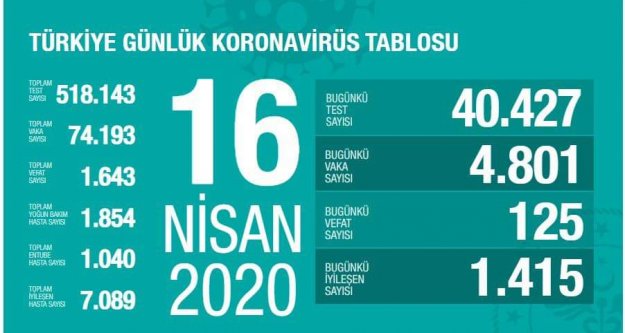 Bakan Koca'nın açıklamasına göre, bugün 40 bin 427 test yapılırken 4 bin 801 yeni vaka tespit edildi. Bugün Türkiye'de koronavirüsten 125 kişi hayatını kaybederken 1.415 kişi iyileşti. Toplam ölüm sayısı 1.643 olurken toplam vaka sayısı ise 74 bin 193 oldu.
