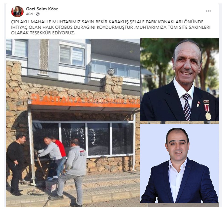 2019 yılında başladığı muhtarlık görevinde mahalle halkından kimseyi ayırt etmeksizin görevine devam eden ve herkese eşit hizmet veren Muhtar Karakuş, Çıplaklı Mahallesi’nde ikamet eden Terörle Mücadele Gazisi Saim Köse’nin de takdirini kazandı. Muhtar Karakuş’a otobüs durağı için talepte bulunduğunu ve talebinin ivedilikle çözümü kavuştuğunu belirten Gazi Saim Köse, sosyal medya hesabından Çıplaklı halkına yönelik şu mesajları paylaştı: “Çıplaklı Mahalle Muhtarımız Sayın Bekir Karakuş, Şelale Park Konakları önünde ihtiyaç olan halk otobüs durağını koydurmuştur. Muhtarımıza tüm site sakinleri olarak teşekkür ediyoruz.”