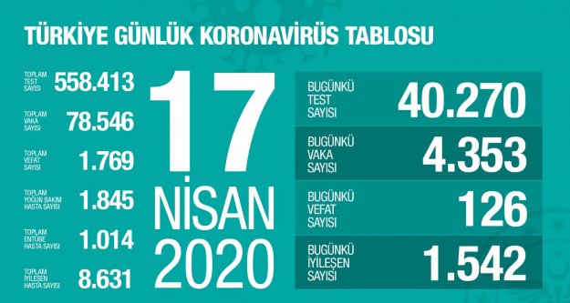 Sağlık Bakan Fahrettin Koca'nın açıklamasına göre, bugün 40 bin 270 test yapılırken 4 bin 353 yeni vaka tespit edildi. Bugün Türkiye'de koronavirüsten 126 kişi hayatını kaybederken 1.545 kişi iyileşti. Toplam ölüm sayısı 1.769 olurken toplam vaka sayısı ise 78 bin 546 oldu.