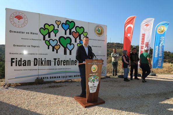 Fidan dikim töreninde katılımcılara konuşma yapan Kaymakam Ürkmezer “Her yıl geleneksel hale gelen 11 Kasım Milli Ağaçlandırma günü kapsamında geleceğe nefes olmak amacıyla bu yıl da tüm Türkiye’de olduğu gibi Alanya’mızda da fidan dikim etkinliği gerçekleştiriyoruz. Bu etkinliklerin en güzel tarafı çocuklarımızın yeşili ve ağacı severek doğayı koruma bilincini öğrenerek büyümeleri oluyor. Her çocuğumuzun birer fidan dikmesi bu dünyaya bir dikili ağaç bırakmaları ve bu durumun gelecek nesillere aktarılması çok güzel bir olay. Bizlerin ise çocuklarımıza temiz bir Dünya, doğası temiz, denizi temiz bir Türkiye bırakmamız gerekli. İlçemizde yangınlar meydana geliyor. Orman teşkilatımız gerekli çalışmaları yaparak anında müdahalede bulunarak meydana gelebilecek tehlikeleri önlüyor. Bizim amacımız ise yangının meydana geldiği yerleri tekrardan yeşillendirerek doğaya kazandırmak. Bu anlamda Tarım ve Orman Bakanlığımız öncülüğünde bütün ülkemizde uygulanan bu etkinliğin memleketimize hayırlı olmasını temenni ediyorum. Bugün burada bu etkinliği beraber gerçekleştirdiğimiz paydaş kurumlarımıza, Orman Müdürlüğümüze, Belediyemize ve Başsavcılığımıza teşekkür ediyorum. Geleceğe nefes olmak adına herkesi bir fidan dikmeye davet ediyor ve tüm herkesin Milli Ağaçlandırma Bayramını kutluyorum” dedi.