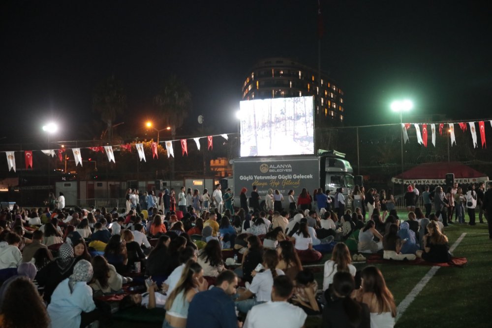 Alanya Belediyesi tarafından bu yıl ilki düzenlenen Açık Havada Sinema Gecesi’nde binin üzerinde üniversite öğrencisi Kestel Futbol Sahası’nda bir araya geldi.