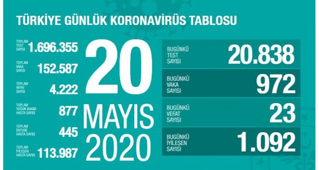 Sağlık Bakanlığından yapılan açıklamaya göre, son 24 saatte 23 kişinin daha korona virüsten hayatını kaybetmesi ile toplam can kaybı 4 bin 222 oldu. Bugün toplam 20 bin 838 test yapılırken, 972 yeni vaka tanısı konuldu. Toplam vaka sayısı ise 152 bin 587 oldu.