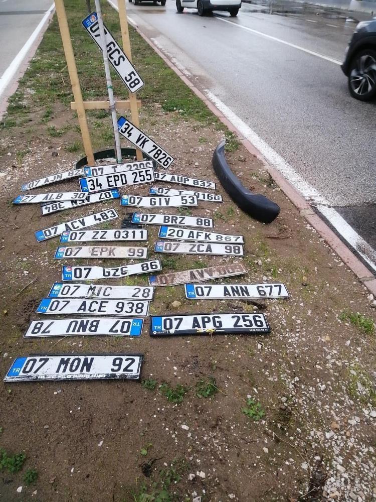 Antalya’da aşırı yağışın ardından sel sularına karışan araç plakaları refüjde sergilendi.