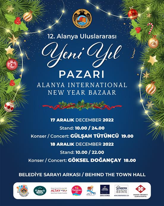 Alanya Belediyesi ve Yabancılar Meclisi tarafından düzenlenen Alanya Uluslararası Yeni Yıl Pazarı 12. kez kapılarını açacak. Artık bir klasik haline gelen dev organizasyon, 17 Aralık Cumartesi ve 18 Aralık Pazar günleri saat 10.00 ile 22.00 arasında gerçekleştirilecek. Yeni Yıl Pazarı Alanya Belediye Hizmet Binası arkasında her zaman ki yerinde yapılacak.
