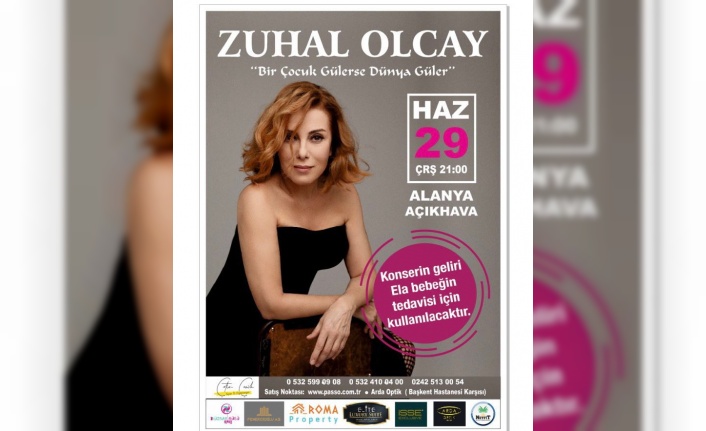 Alanya’da SMA Tip 1 hastalığı ile mücadele eden ve tedavisi için kampanyalar düzenlenen Ela bebeğe bir destek de ünlü sanatçı Zuhal Olcay’dan geldi. Zuhal Olcay, “Bir Çocuk Gülerse Dünya Güler” sloganı ile 29 Haziran’da Alanya Açık Hava Tiyatrosu’nda yapılacak konserde sahne alacak. Konser biletleri Başkent Üniversitesi Hastanesi karşısındaki Arda Optik’te ve www.passo.com.tr adresinde satışa sunuldu. Organizatörler geliri Ela bebeğin tedavisi için kullanılacak konsere tüm Alanya halkını davet etti.