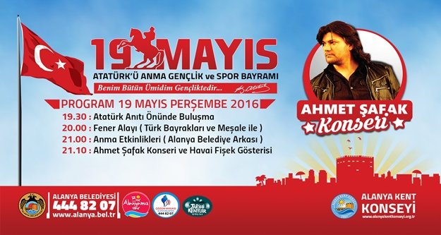 Alanya Belediyesi ve Kent Konseyi işbirliğiyle düzenlenen etkinliklerle her yıl 19 Mayıs Atatürk’ü Anma Gençlik ve Spor Bayramı’nı coşkuyla kutladıklarını söyleyen Alanya Kent Konseyi Başkanı Nurhan Özcan, kutlama programı hakkında bilgi verdi. Özcan, “19 Mayıs’ı bu yıl daha da kapsamlı kutlamaya hazırlanıyoruz. Programımız, Alanya Belediyesi ve Alanya Kent Konseyi Gençlik Meclisi’nin, 19 Mayıs Perşembe 19:30’da Atatürk Anıtı önünde düzenleyeceği fener alayıyla başlayacaktır. Türk Bayrakları eşliğindeki fener alayı ve gençlerin görev aldığı kortej, iskele yolu rıhtım üzerinden yürüyerek Belediye Arkasındaki konser alanına gelecektir. Program, gençlerin Atatürk’ün Gençliğe Hitabesi ve Gençliğin Ataya cevabını, okumasının ardından saat 21.10’da Ahmet Şafak Konseri ile devam edecektir” dedi.