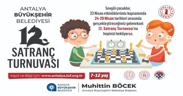 Antalya Büyükşehir Belediyesi, Antalya İl Milli Eğitim Müdürlüğü, Antalya Gençlik Spor İl Müdürlüğü ve Türkiye Satranç Federasyonu Antalya İl Temsilciliği işbirliğiyle gerçekleştirilecek, 12. Geleneksel Antalya 23 Nisan Ulusal Egemenlik ve Çocuk Bayramı Satranç Turnuvası 24-29 Nisan tarihleri arasında 12 kategoride online yapılacak. 7-12 yaş grubu öğrencilerin mücadele edeceği turnuvaya kayıt ve başvuru işlemleri www.antalya.tsf.org.tr adresinden yapılacak.
