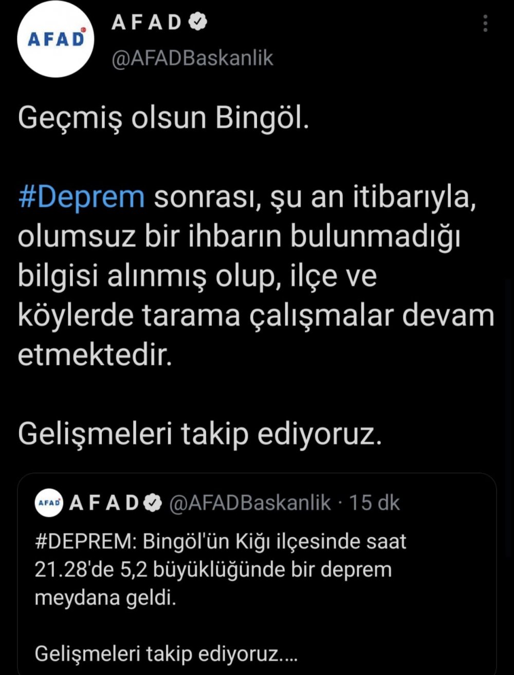 AFAD'dan yapılan açıklamada, “Deprem sonrası şuan itibariyle olumsuz bir ihbarın bulunmadığı bilgisi alınmış olup, ilçe ve köylerde tarama çalışmaları devam etmektedir“ denildi.