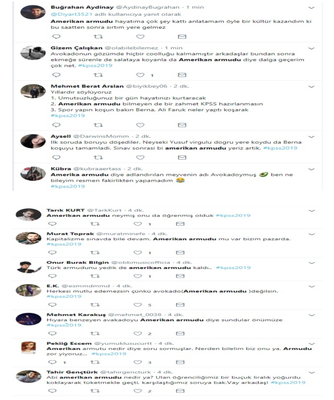 2019-KPSS A Grubu ve Öğretmenlik (Genel Yetenek-Genel Kültür/Eğitim Bilimleri) sınavının ilk oturumunun tamamlanması ardından ilk yorumlar gelmeye başladı. Adaylar, KPSS yorumlarını Twitter üzerinden yaptı. Özellikle Amerikan armudu olarak da bilinen ve Alanya'da çok miktarda üretilen Avokado sorusu ön plana çıktı.